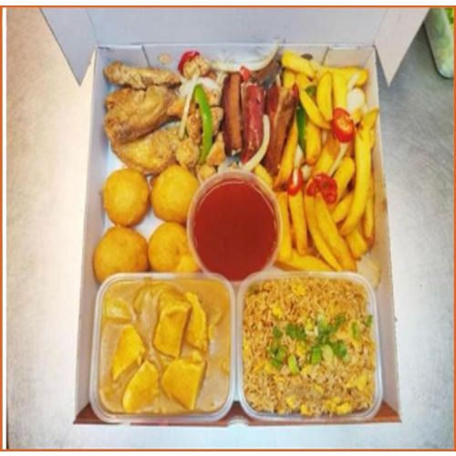 Mini Spring Rolls, Prawn on toast, Chicken Balls, Salt & Pepper Ribs, Chicken Wings, Chips, Chicken Curry, Egg Fried Rice & Sweet & Sour Sauce